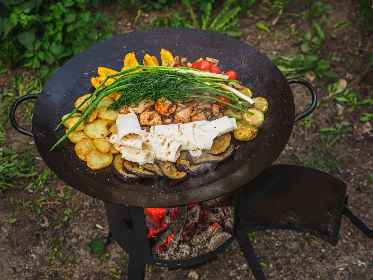 · Если вы планируете обзавестись чугунным вок, казаном или саджем, обратите внимание на их размеры, чтобы они могли удерживаться на выбранном вами учаге.
