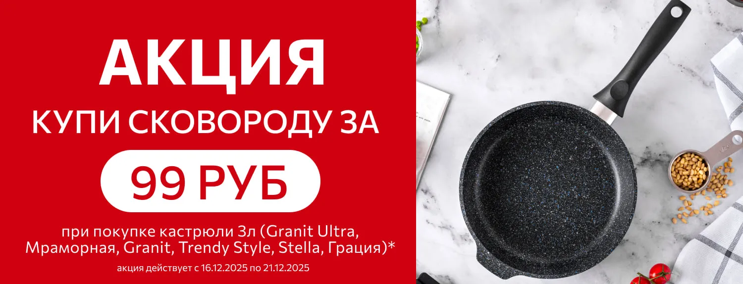 При покупке кастрюли или кастрюли-жаровни из наших популярных коллекций "Granit ultra", "Мраморная", "Trendy style", "Granit", "Stella" или "Грация" (в стильной черно-золотой или черно-серебряной расцветке) вы получаете одну сковороду из этой же коллекции почти даром!